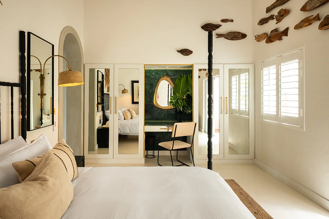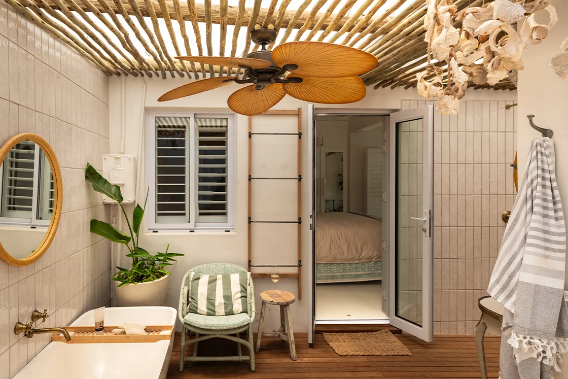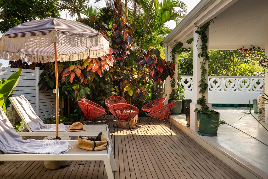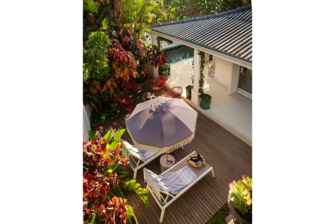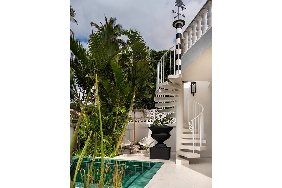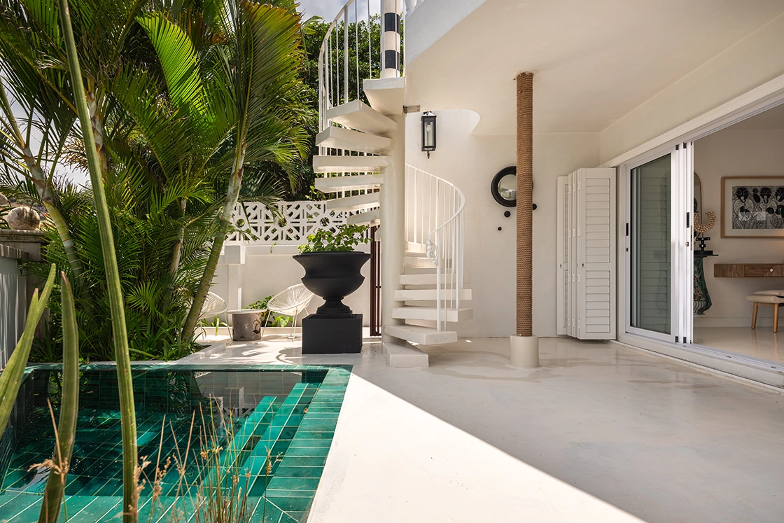 The one-bedroom cottage sits just apart, with its own entrance and a sense of independence. It has its own en-suite bedroom, outdoor bathroom, plunge pool and a whimsical spiral staircase that leads up to a rooftop deck. It’s charming, slightly unexpected and entirely in keeping with the home’s personality.