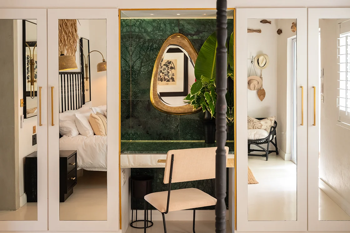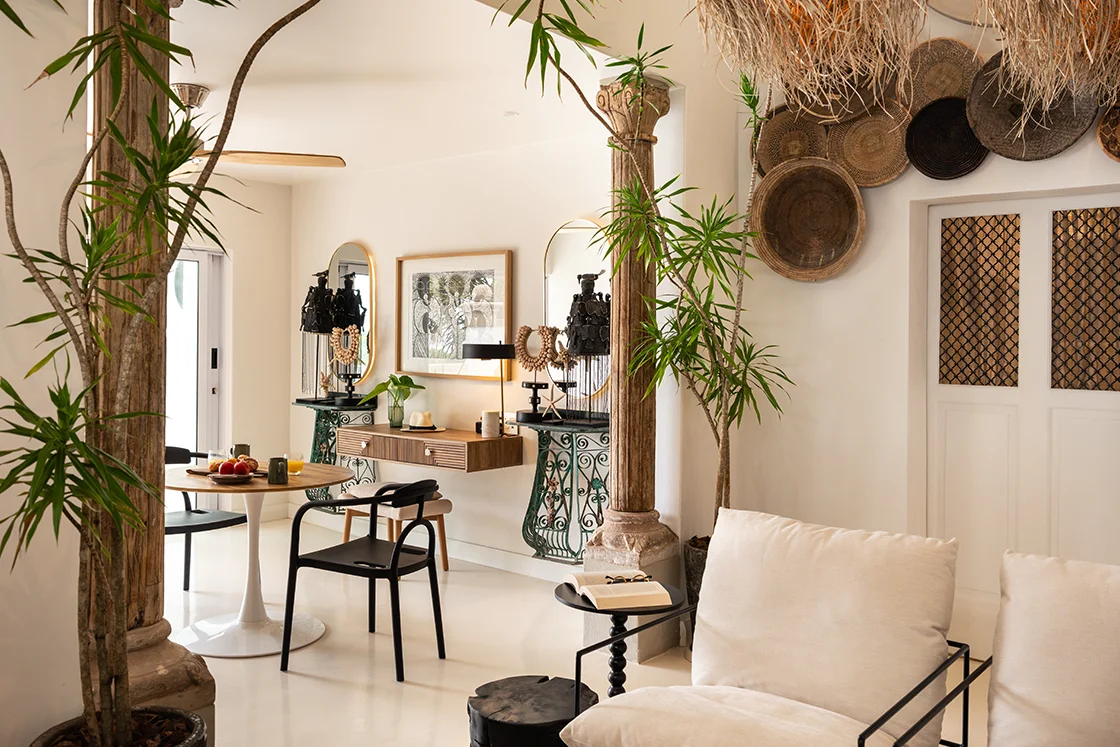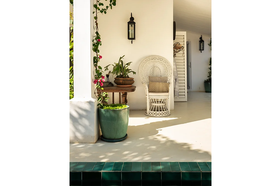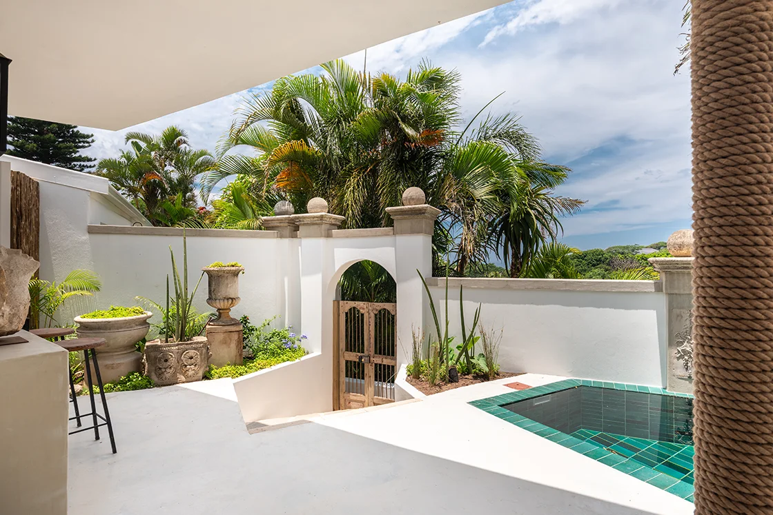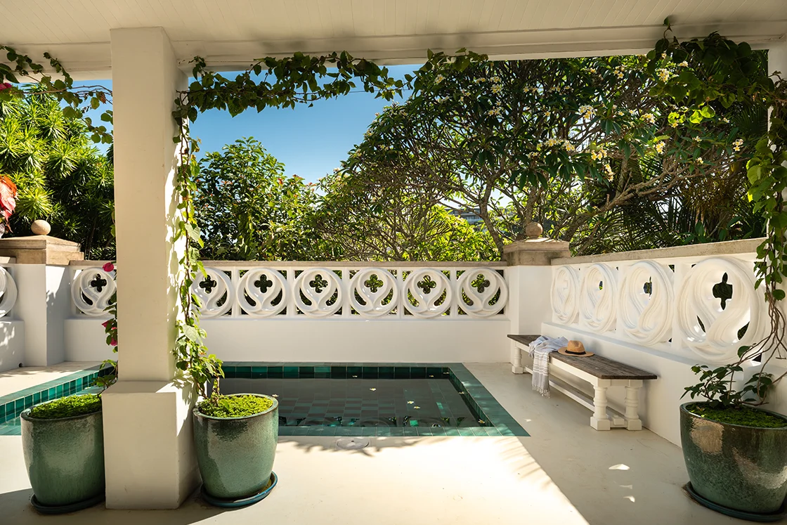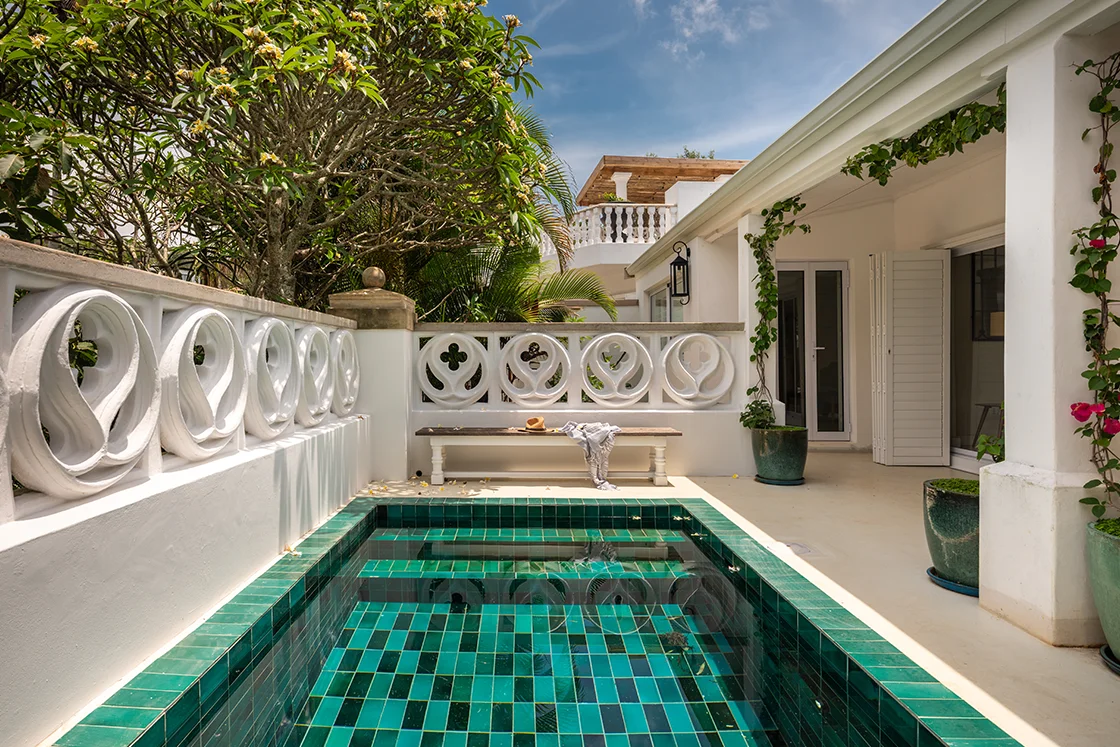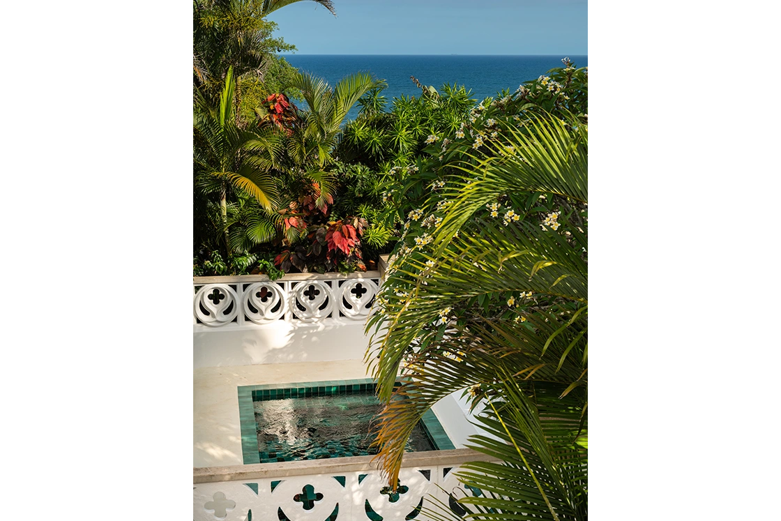 There’s a hint of baroque in the detailing, softened by the relaxed pace of the coast. Rococo-style courtyard walls hold back lush, exuberant greenery. Glossy jade, sea green and emerald tiles catch the light in the plunge pools. It’s rich, layered and unexpectedly playful.