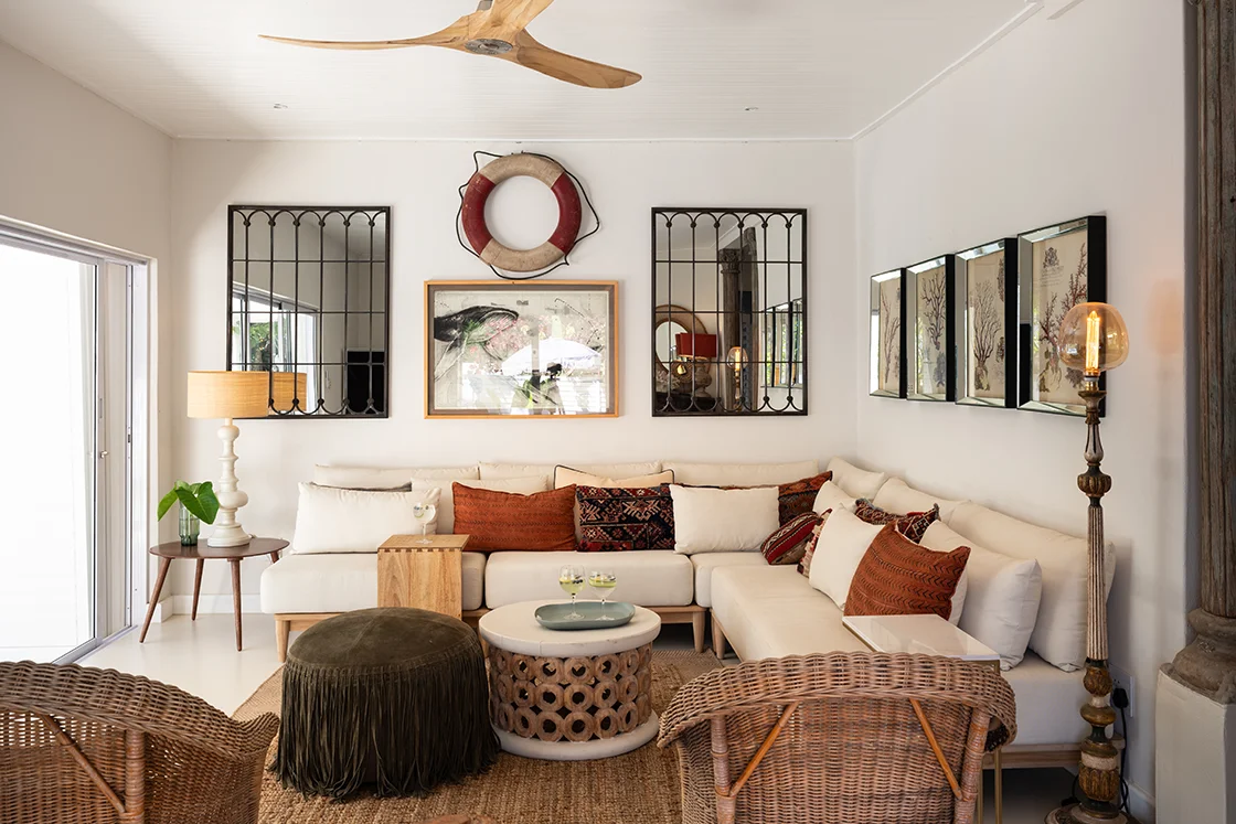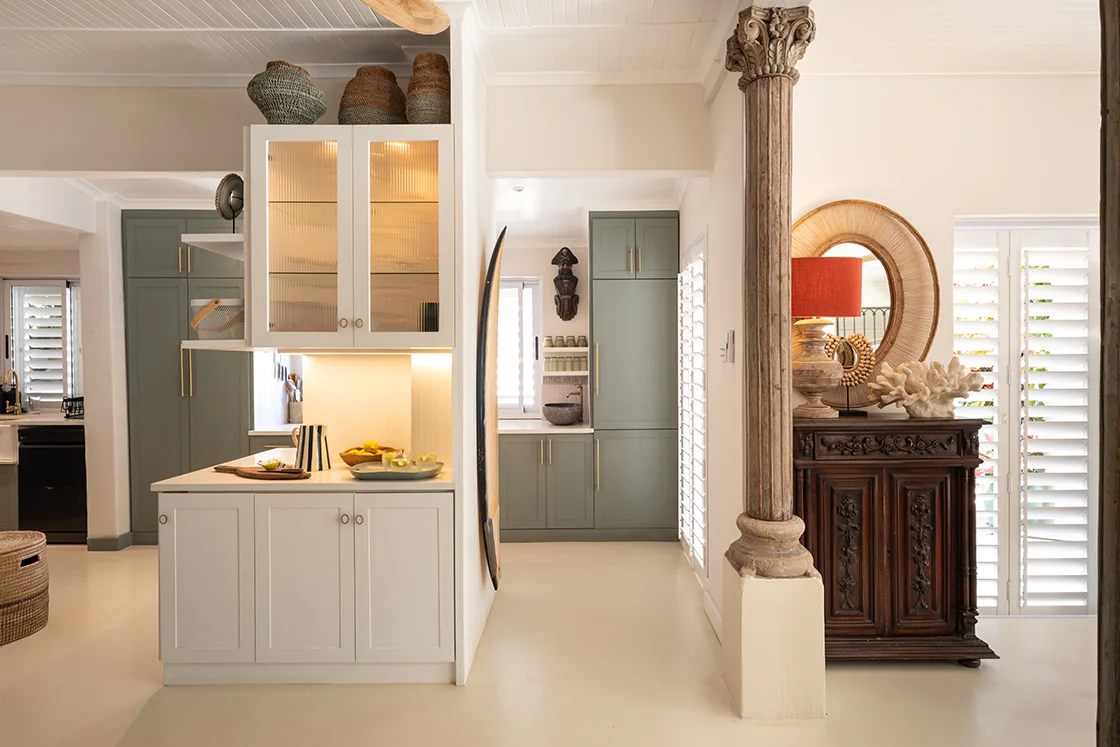 Thick walls have been opened up to let in air, light and conversation. The palette is calm and neutral, lifted by warm African textures – wood, rattan, woven grasses. Striking grass light shades sit comfortably alongside elegant shell chandeliers. There’s always a thread of green – in a marble kitchen accent, a glazed bathroom wall, the easy presence of indoor plants.