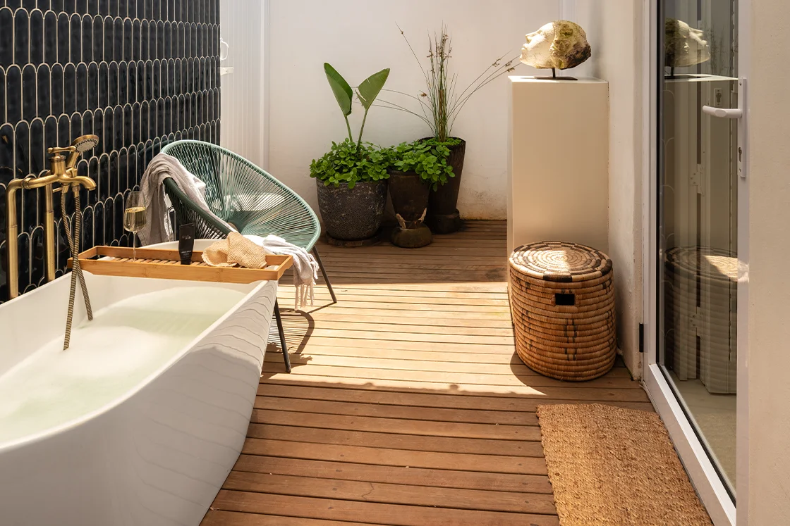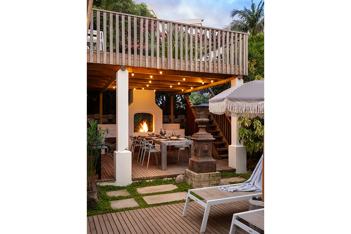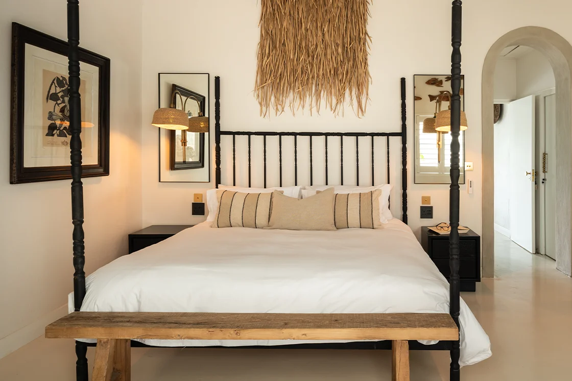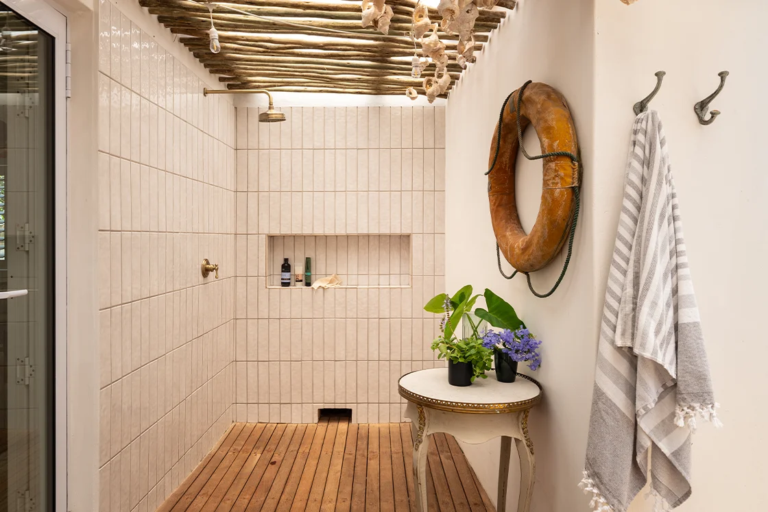 The main house sleeps six across three en-suite bedrooms, each with its own private outdoor sitting area and an alfresco bath or shower beneath fairy lights and stars. It’s indulgent, yes – but also deeply rooted in place.