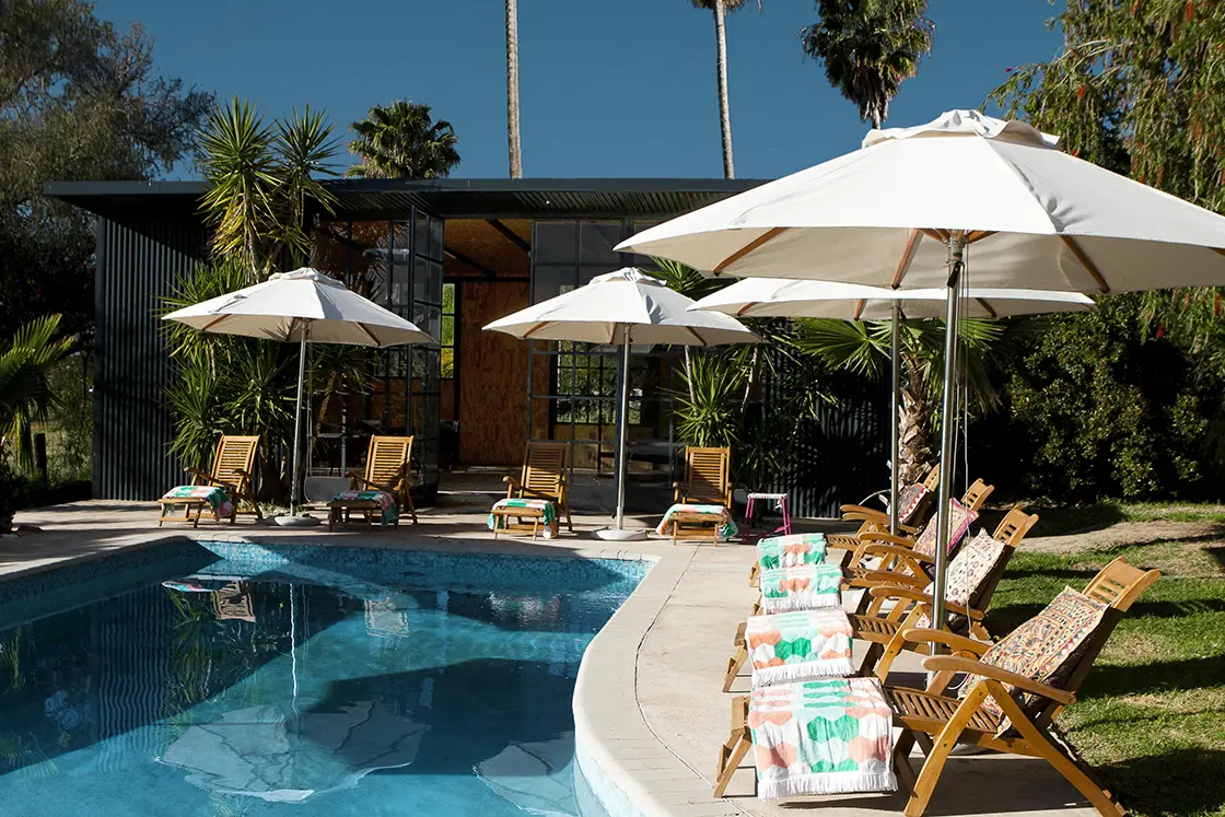 The garden itself is the owner’s pride and joy. A river runs at its edge, a saltwater pool lies tucked between palms and winding paths reveal one inviting corner after another. It is both cultivated and wild, designed and yet unpretentious. A place where you can dip into the pool, harvest from the garden or simply stargaze into the endless West Coast night.