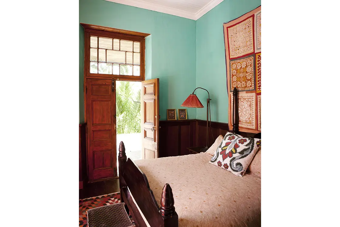 If Couvaloup has a heart, it is the wide stoep that runs the length of the house. Shaded and welcoming, it overlooks a lush garden where palm trees stretch skyward and sculptures gifted by friends find their resting place. This is where guests linger with morning coffee, lose themselves in a book or sip a sundowner as the heat of the day softens into evening.