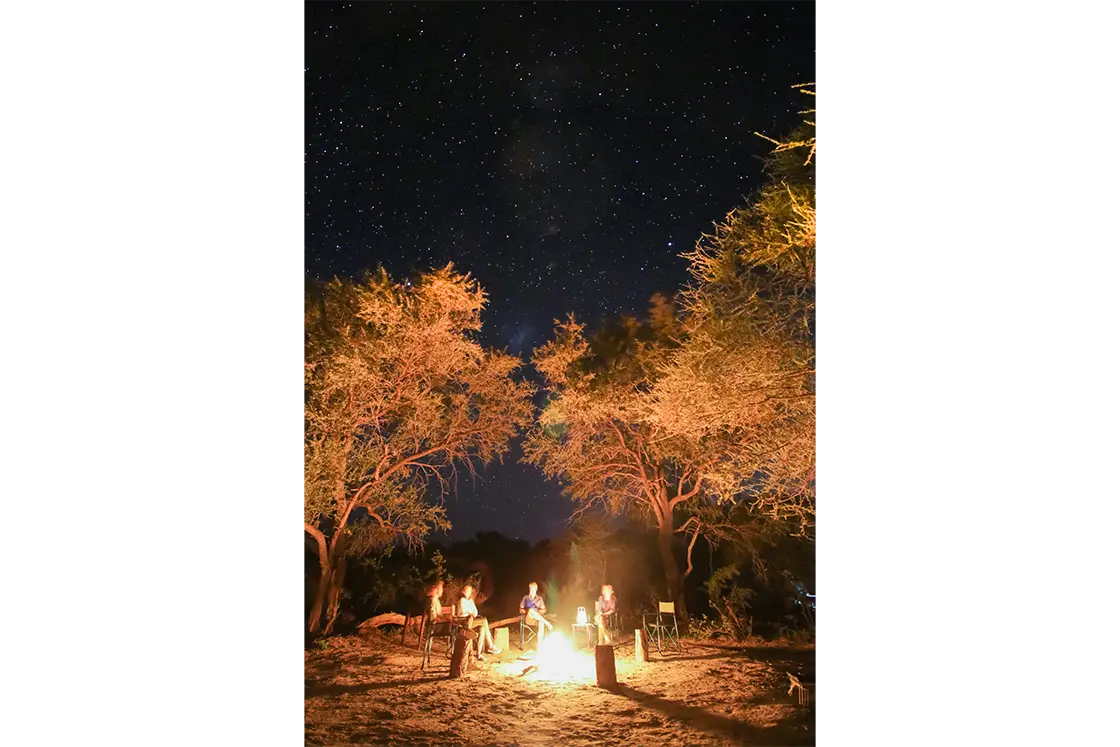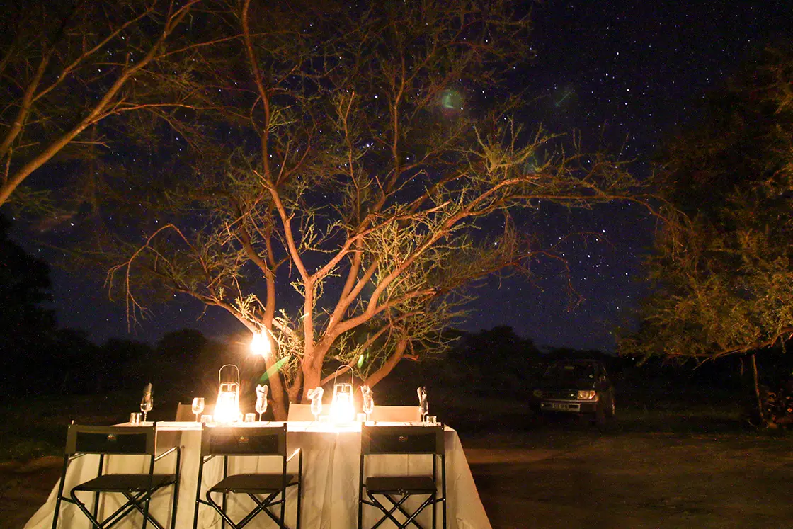 Evening brings sundowners beside the fire, with bushbabies leaping among the trees. Enjoy a braai or whip up a feast in the well-equipped kitchen to savour in the beautiful mess tent. A night camera beside the waterhole reveals ghostly images of nocturnal visitors, from bats and genets to a graceful aardvark.
