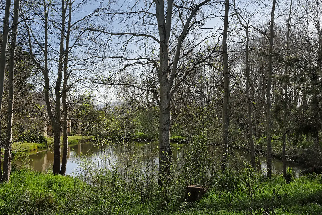 However, Waterkloof is more than a horse farm for sale in the Winelands! The beautiful land rolls across 13 hectares of paddocks, with dams and plenty of fruit trees. Old oaks stand sentinel, shading corners where you can linger on hot days. Two natural dams reflect the sky and attract birdlife. The surrounding Paarl mountains shift from gold to pink to indigo as the sun moves – a living canvas at the edge of every window and verandah.
