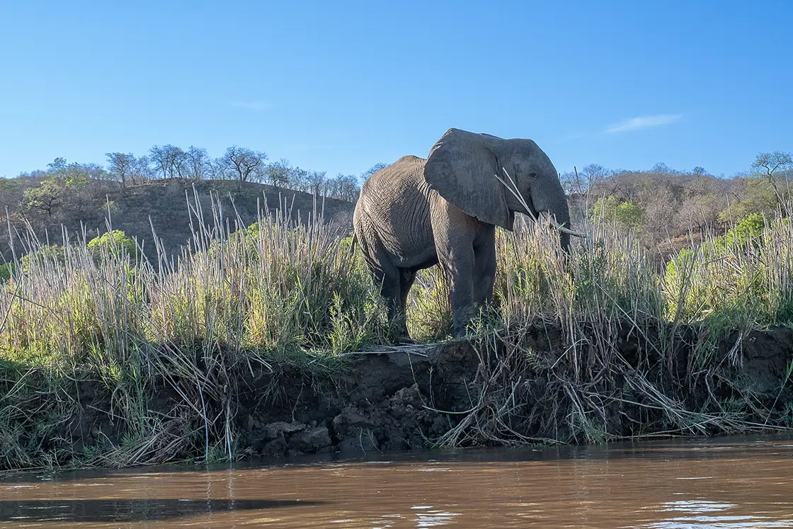 Elephants are almost always in the vicinity, leopards are a permanent presence, and lion and buffalo pass through more and more often, along with a variety of plains game including zebra, waterbuck, kudu, bushbuck and impala. Hippos are always in view (and in earshot), while crocodiles can be spotted sunning themselves on sandbanks and islands.