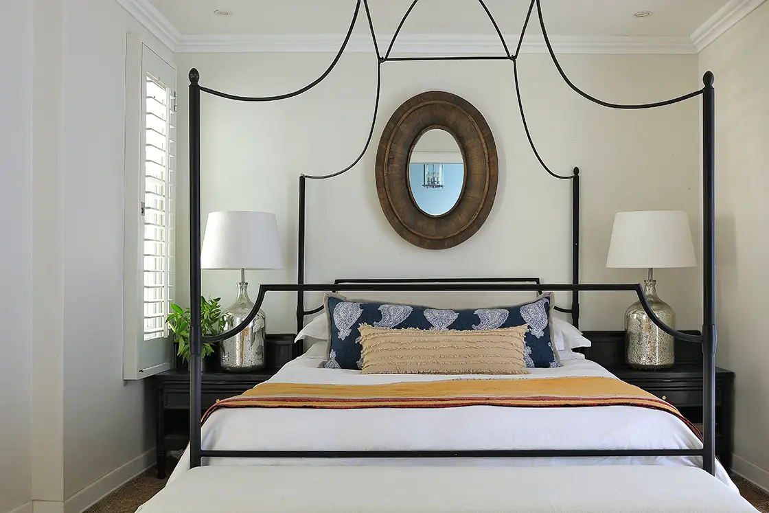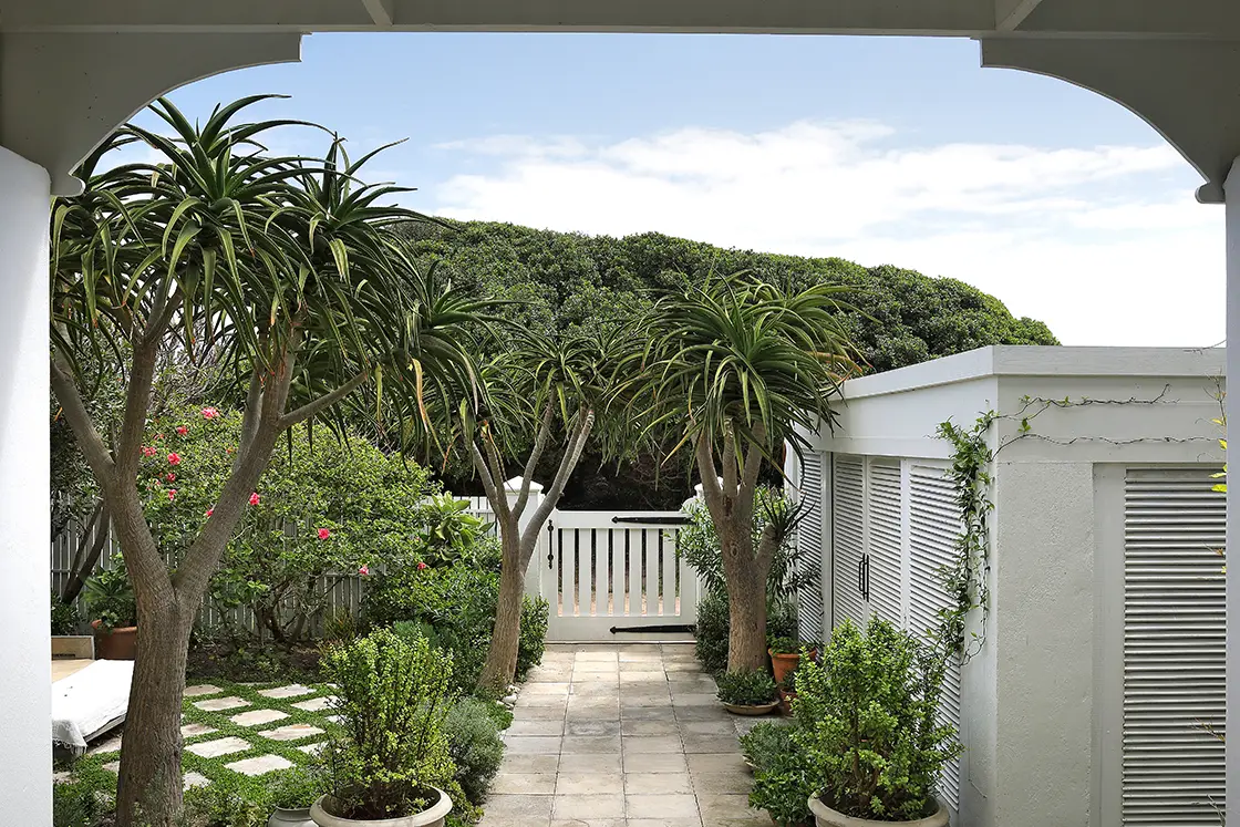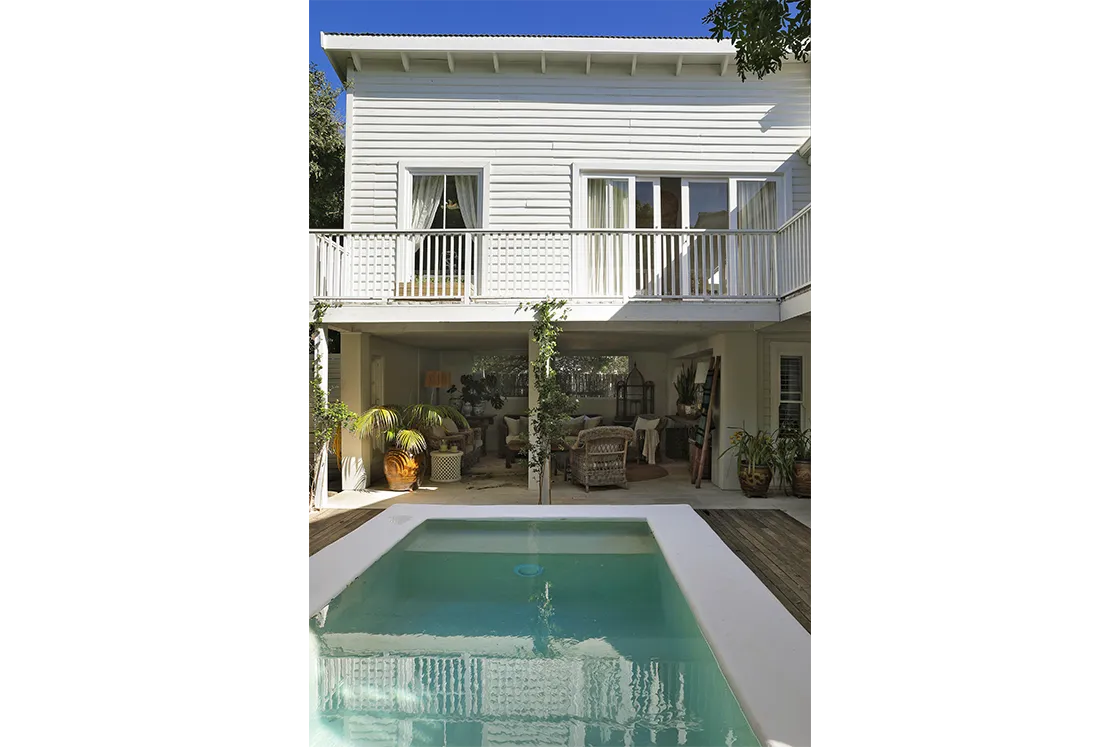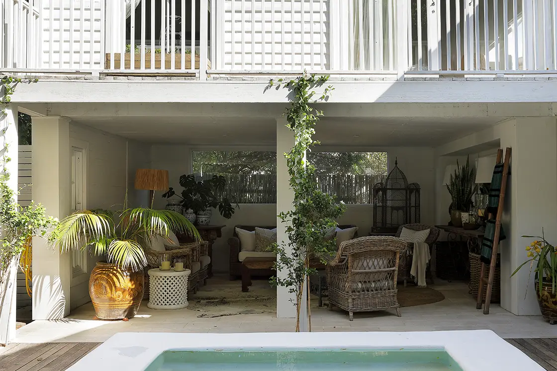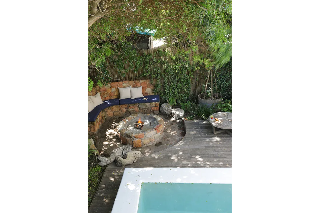 Stroll through the generous hall to the completely private courtyard behind. This sheltered space – with its pool, built-in stone firepit and deep verandah – is made for lazy afternoons, sundowners and family gatherings that stretch long into the evening. It’s calm and secluded, shaded from wind and sun, filled with the scent of jasmine vines, sounds of birds and waves breaking on the long white beach. If you linger long enough, you might spot the resident weaverbird fussing over his nest on a branch above the pool.